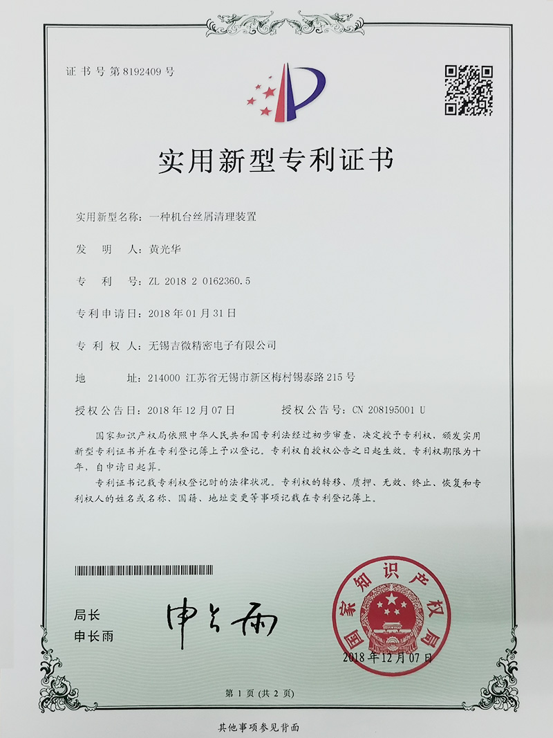 一種機臺絲屑清理裝置實用新型專利證書