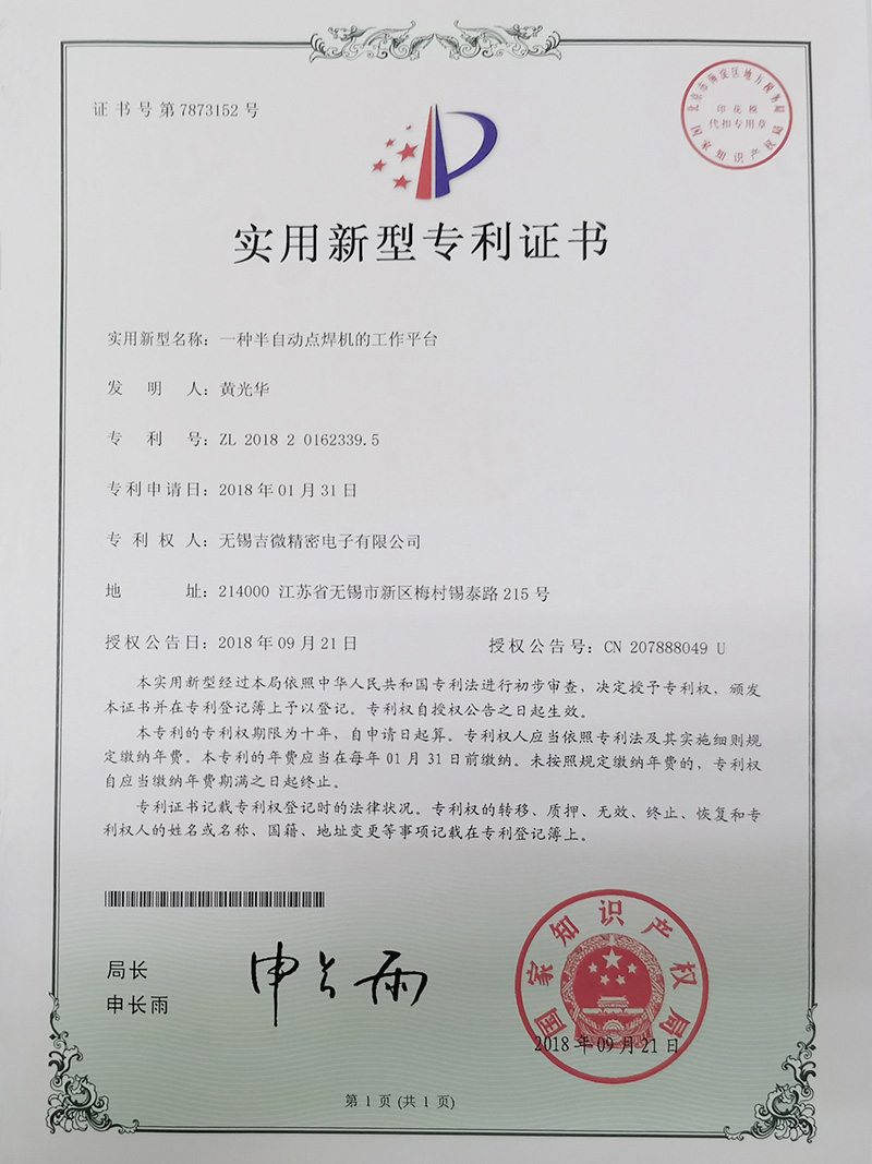 一種半自動點(diǎn)焊機(jī)的工作平臺實(shí)用新型專利證書